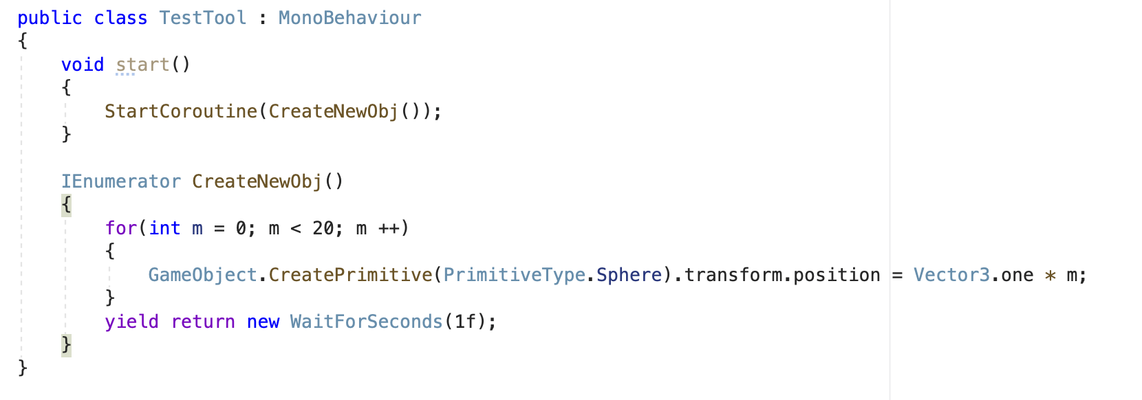 Unity的script不支持多线程,为了模拟多线程,Unity引入了C#中的协程。Unity中的协程适用于对并行要求不高的、低开销的操作,如果操作的性能开销比较高,那么使用协程可能会造成卡顿。 下图是一个例子,每隔一秒创建一个游戏对象。